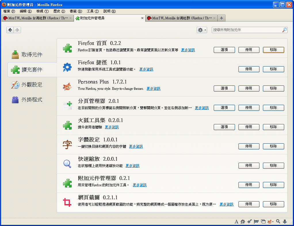 請注意:我們發現由 Mozilla Taiwan 所製作的美商謀智台灣版 Firefox當中包含的某些附加元件內含使用者行為追蹤相關程式,根據程式碼研判,Mozilla Taiwan 公司(台北)與 Mozilla Online(北京)將會針對某些套件安裝後新增加的功能進行行為追蹤。在以下將會特別標示出個別套件的行為追蹤狀態,請使用者斟酌使用。