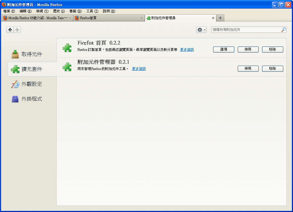 Firefox 台灣版分成基本安裝及自訂安裝兩種安裝模式,選擇基本安裝時,會自動安裝 Firefox 捷徑、火狐工具集、分頁管理器、網頁截圖等四個套件;自訂安裝時,則可從七個擴充套件中任選。不論基本安裝或自訂安裝中如何選擇,都一定會裝上 Firefox 首頁 及 附加元件管理器 兩套件。